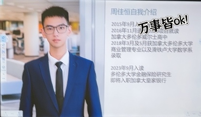 2015年-2016年完成國內(nèi)高一課程,修完雅思、數(shù)學(xué)、物理、化學(xué)、生物課程,2016年11月赴我校OSSD中加班項目的合作學(xué)校-加拿大威爾士高中完成高三年級密集課程。2018年6月以優(yōu)異的成績從威爾士高中畢業(yè),獲得加拿大安省高中OSSD畢業(yè)證。2018年3月和5月先后被多倫多大學(xué)商業(yè)管理專業(yè)以及滑鐵盧大學(xué)數(shù)學(xué)系錄取。2018年9月-2022年6月,就讀滑鐵盧大學(xué)的數(shù)學(xué)專業(yè)。2023年9月考入多倫多大學(xué)金融保險專業(yè),學(xué)習(xí)碩士研究生課程。2024年5月,入職加拿大皇家銀行。
