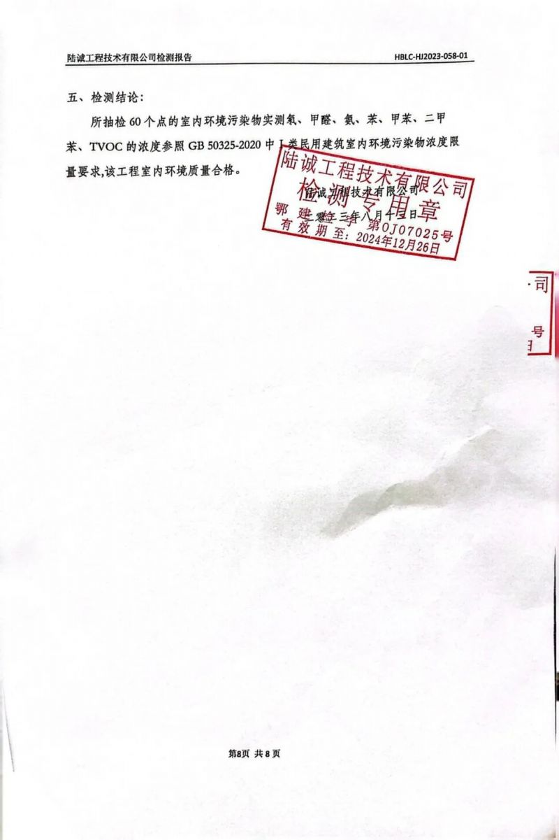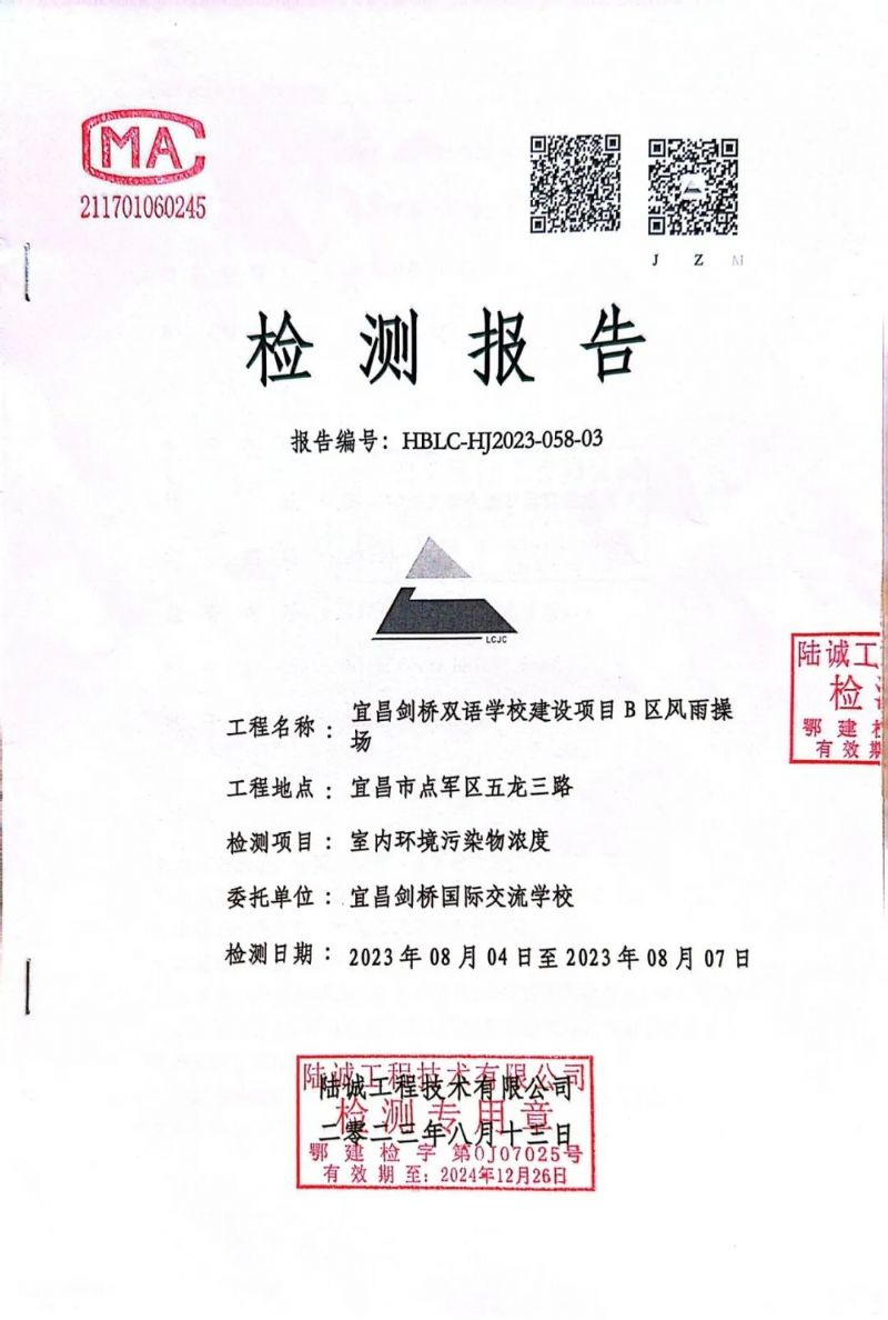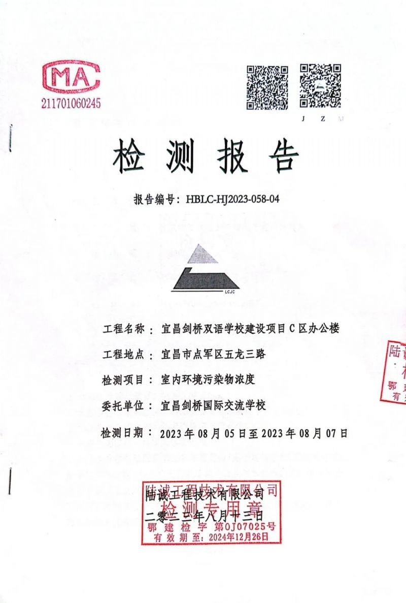 經(jīng)具有環(huán)境檢測資質(zhì)的陸誠工程技術(shù)有限公司對宜昌歐陽修學(xué)校(宜昌劍橋國際交流學(xué)校)新校建設(shè)工程進(jìn)行全面檢測,學(xué)校A區(qū)學(xué)生宿舍1#樓、A區(qū)學(xué)生宿舍2#樓、B區(qū)風(fēng)雨操場、C區(qū)辦公樓、D區(qū)教學(xué)樓均已合格。