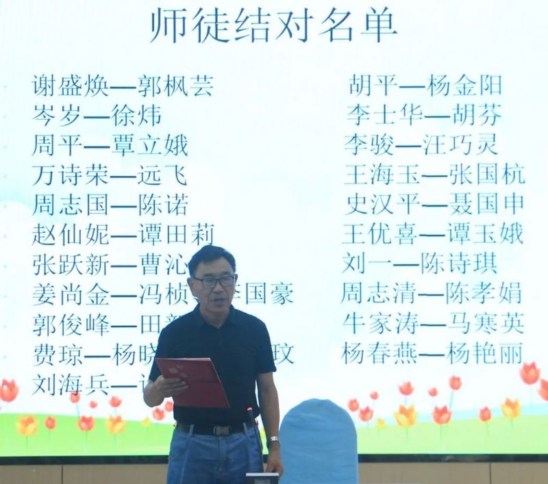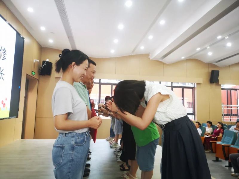 校領導宣布青藍工程結對文件,徐校長、姚校長為指導老師頒發(fā)聘書。一張聘書,不僅代表著一份榮譽,更是一份沉甸甸的責任;新老師們紛紛上臺,對各自的師傅深鞠一躬,拱手為禮,師傅們欣然頷首還禮,舉手投足之間,是互敬互愛的師徒默契,是未來共同進步的無聲承諾。