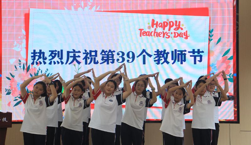 初中部同學代表,用手勢歌舞“聽我說謝謝你”,向老師們傳達了他們的感恩之情。孩子們純稚的歌聲令人感動,每一句“聽我說謝謝你”都如同星辰一般,照亮了整個會場,也點亮了每一顆心。音樂停止的那一刻,臺上臺下,無論師生,心都仿佛融為了一體。