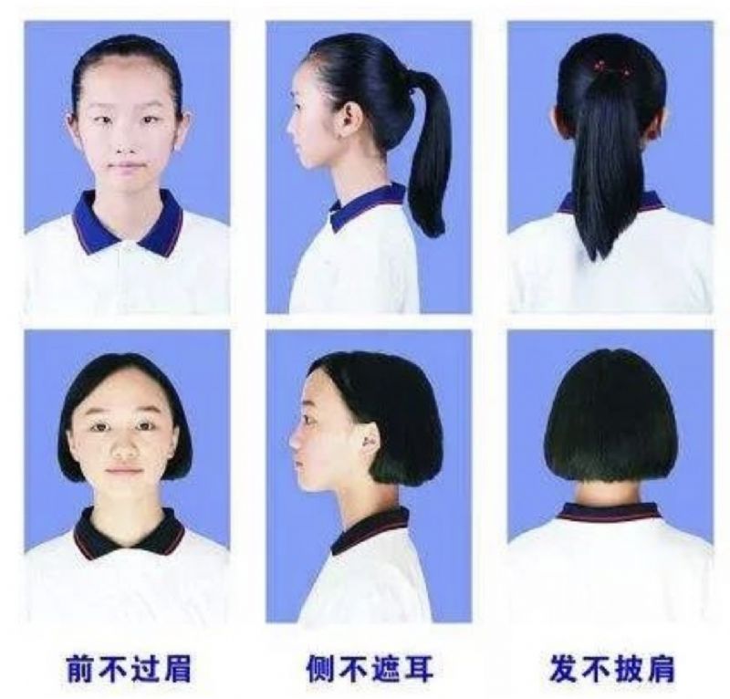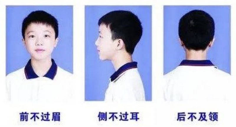 1、儀容儀表符合中學(xué)生規(guī)范,不燙發(fā)染發(fā),不化妝,男生不留長(zhǎng)發(fā)(發(fā)型要求見上圖),不著奇裝異服;學(xué)生在校一律穿校服,不準(zhǔn)佩戴飾物。新學(xué)期報(bào)到時(shí)所有學(xué)生著校服入校(高一年級(jí)、七年級(jí)除外),儀容儀表不合格的不辦理報(bào)名手續(xù)。