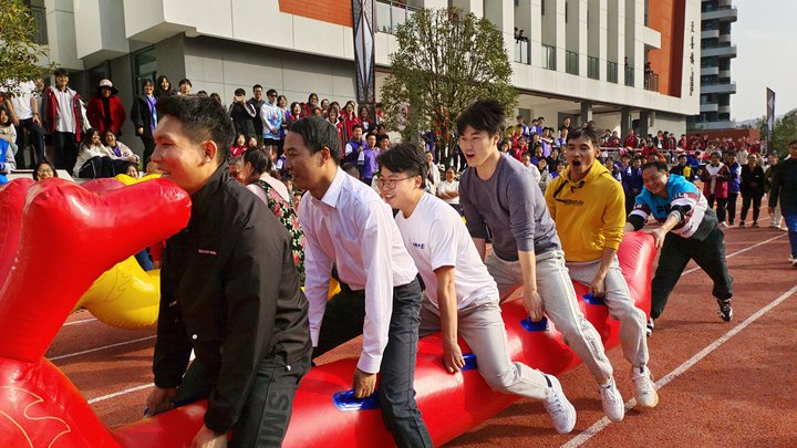 本次體藝節(jié)老師們也參與其中,30米繞桿接力、旱龍舟,有趣的活動(dòng)項(xiàng)目引得大家大笑不止。尤其是旱龍舟,出現(xiàn)了極富戲劇性的一幕,裁判長誤將“記者”撞倒在地,“記者”順勢(shì)坐下拍照,現(xiàn)場(chǎng)掀起出一浪浪的歡呼,卷過龍舟,推著龍舟不斷往前行去,濃濃的師生情融進(jìn)了山呼般的“加油”聲里。