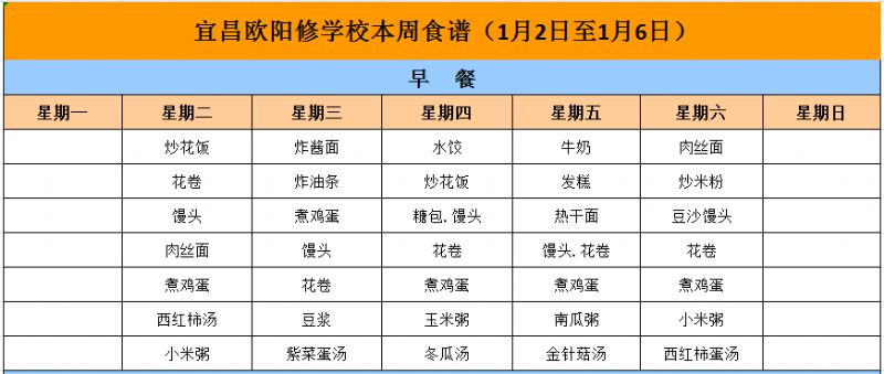 宜昌歐陽修學(xué)校本周食譜(1月2日至1月6日)