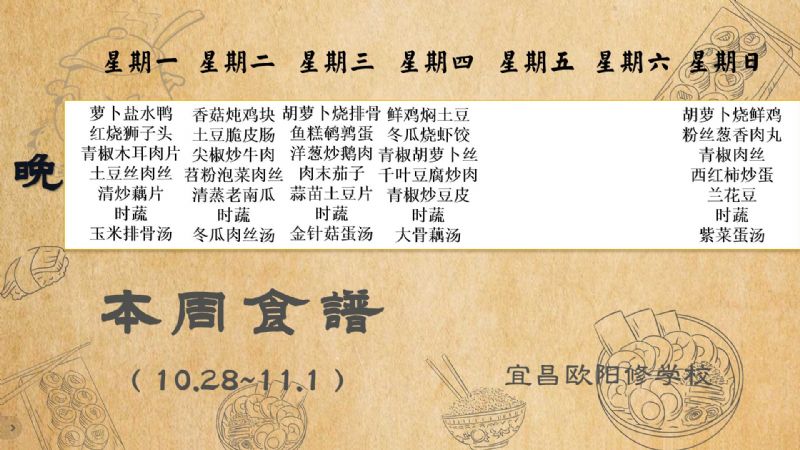 宜昌歐陽修學校每周食譜(10月28日至11月1日)