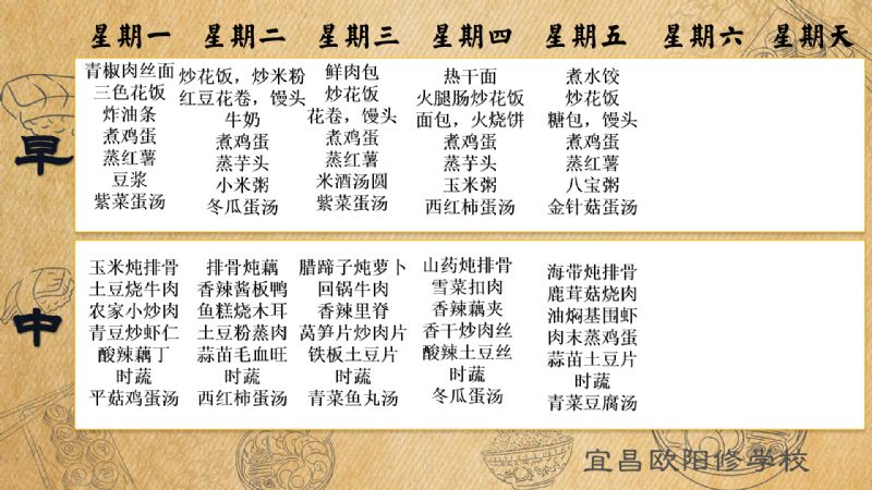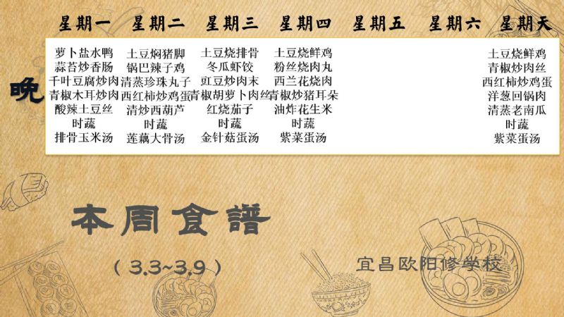 宜昌歐陽修學校每周食譜(3月3日至3月9日)