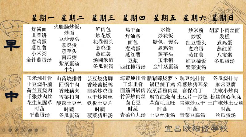宜昌歐陽修學校每周食譜(4月21日至4月27日)