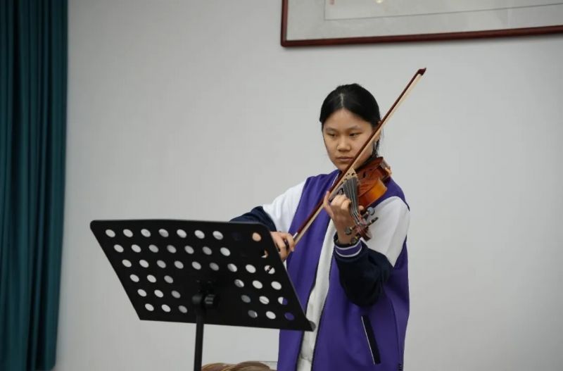 座談間隙,學(xué)生們的精彩表演讓現(xiàn)場溫情再升級:206班盧雨萱的古箏獨奏《春江花月夜》,弦音裊裊、古韻悠長;207班譚力的獨唱《心中的日月》,歌聲清澈、滿含敬意;208班劉彩雯的小提琴獨奏《月半小夜曲》,旋律流轉(zhuǎn)、祝福暗藏。孩子們專注的神情、真摯的情感,贏得老教師們陣陣掌聲。